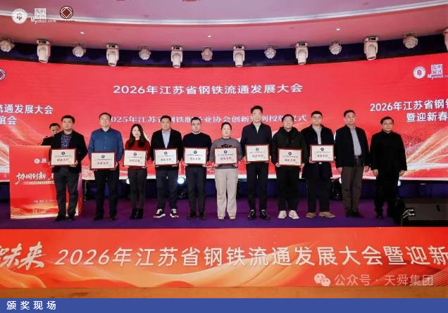 会议期间,省钢协领导致辞并发布年度重要事件与优秀案例。天舜集团凭借在高强钢筋领域的持续创新与规模化应用,荣膺“2025年江苏省钢铁服务业协会创新案例奖”,获得了行业的权威认可。